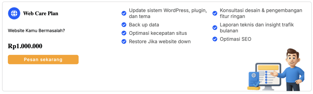 Perawatan website menyeluruh oleh tim profesional, memastikan situs Anda selalu cepat, aman, dan bebas gangguan